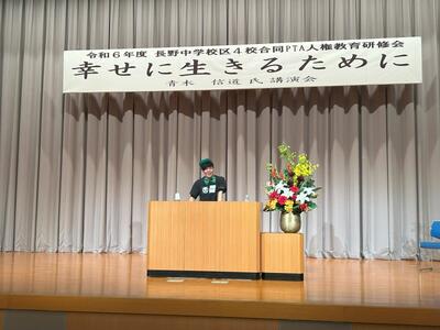 長野中学校区4校合同PTA人権教育研修会が行田市教育文化センター(みらい)で開催されました。講師として、市内の有名店、うどん居酒屋「大地」の店主をお招きして講演していただきました。店主のお話を通して、常にポジティブであること、常に向上心をもち学び続けていること、そして、人としての魅力を一貫して感じました。これは、成功している経営者に共通することです。店主の明るい人柄と内容の深いトークに引き込まれ、あっという間に時間が過ぎてしまう、そんな講演でした。お客様の多い土曜日にご講演くださり、ありがとうございました。