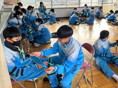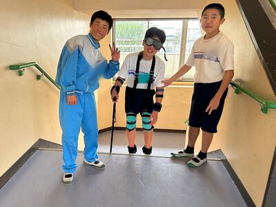 同じく学活の時間、1年生はキットを身に付けて高齢者体験を行っていました。
