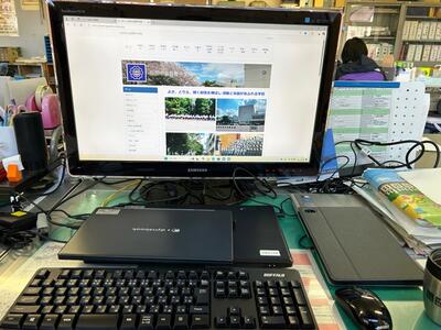 校務用のPCが新しくなり、高性能で嬉しいのですが、画面が小さくなってしまったので、外付けモニタとキーボード、マウスを用意し使うことにしました。前のパソコンやタブレットも手放せず、机の上は大変なことになっています。