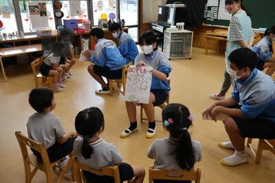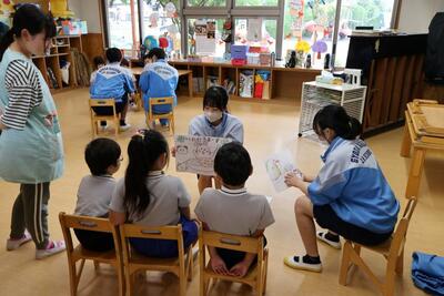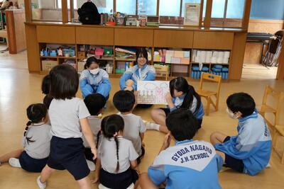 家庭科の保育の学習で3年1組が保育実習を行いました。実習先は行田幼稚園です。中学生は最初は緊張して照れている感じでしたが、幼稚園児たちと歌や紙芝居、いす取りゲームなどでふれあうことによってすぐに慣れ、優しいお兄さん、お姉さんぶりを発揮していました。学校での普段の姿とは違った姿や表情を見ることができ、こちらも嬉しくなりました。体験を通してたくさんのことを学んだはずです。そして、それを将来に活かしてほしい、そう願います。