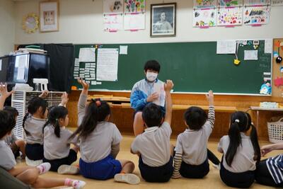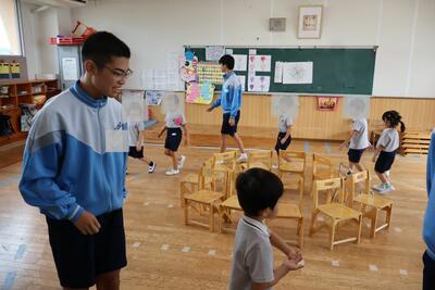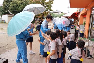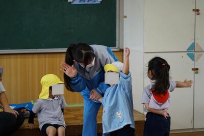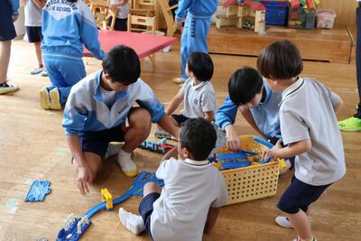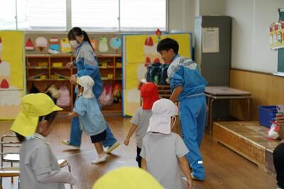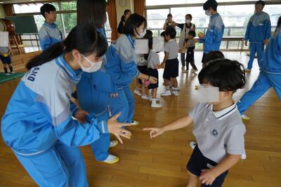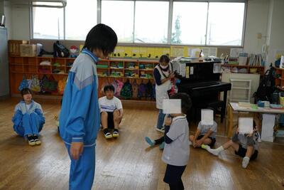 本日、3年4組が保育実習で行田幼稚園を訪問しました。あいにくの雨で外遊び等はできませんでしたが、室内でも身体を使ったゲームなどを行い、楽しんでいました。園児たちの素直な反応やかわいらしさに「癒やされる~」という中学生の声がたくさんあがっていました。あっという間にやってきたお別れの時間では、園児たちが中学生に抱きつき、最後のふれあいをしていました。園児のみんなから「バイバーイ」と手を振ってもらい、短時間でもこんなに愛され、楽しむことができたのだなあと感じさせられました。いい時間でした!