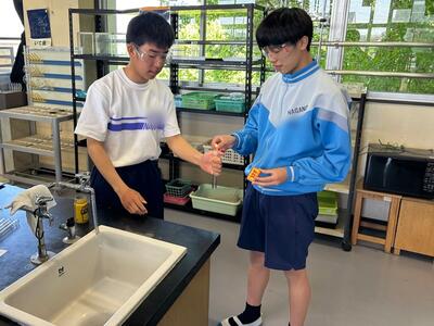 本校南棟の2階に理科室が3つあるのですが、今1年生は身のまわりの生物の観察、
