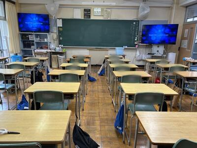 教室全体を入れようとして広角レンズを使っているので、少し写真が歪んでいます。