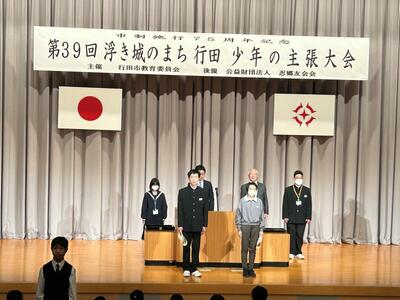 第39回浮き城のまち行田少年の主張大会が行田市教育文化センターみらいで行われ、本校代表の3年生が出場しました。タイトルは「幸せの種」。渋沢栄一の生き方から学び、自分も周りの人を幸せにできる人になりたいという、立派な演説でした。他の学校の小中学生も自分の意見を堂々と発表し、子供たちのしっかりとした考えに触れることができて、とてもいい気持ちになりました。