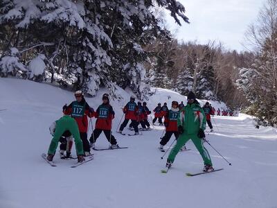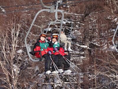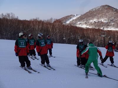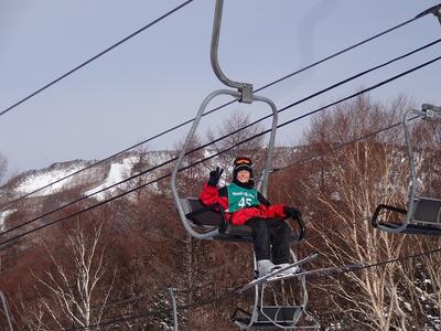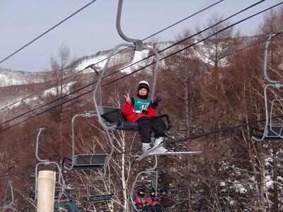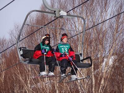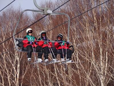1日目に基本技術を学んだ生徒たちは、班ごとに次々とリフトに乗って山の上へと上っていきました。
